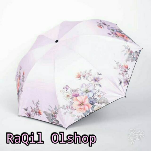 Payung lipat 3 motif karangan bunga. Payung model melengkung (setengah mangkok).Payung cantik, manis, dan berkualitas.Tersedia dalam 4 varian warna seperti digambar: navy, ungu, putih dan biru muda.Panjang payung (dilipat) 24cmDiameter payung 85-90cmBagian dalam payung dilapisi dengan lapisan antiUV tebal warna hitam sehingga tidak panas pada saat dikenakan dibawah terik matahari. ** Barang di cek ulang sebelum dikir