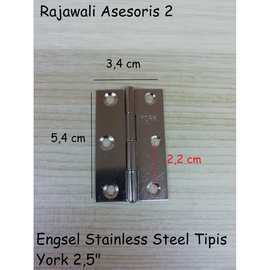 Engsel Stainless Steel Tipis 2,5" YorkMerk : YorkUkuran: 2,5"Ketebalan : 1 mmHarga per pasangBahan Stainless Steel1 dus terdiri dari 12 pasangKegunaan : Untuk engsel keperluan meubel, furniture, box, dllProduk tidak dilengkapi s
