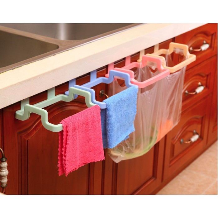Penggantung Kantong SampahGantungan unik berbentuk jepitan plastik sampah, bisa jepit plastik apa aja. Uniknya, tempat sampah ini bisa digantung ke pintu lemari dapur fungsinya untuk memudahkan saat membuang ampas sayuran. Tidak perlu repot memindahkan ampas sayuran dari meja dapur ke bak sampah, tidak mengotori tangan anda tentunya.Gantungan ini juga bisa digantung di pintu laci kamar tidur atau laci ruang kantor, memudahkan anda saat membuang sampah bekas cemilan atau kertas bekasCara Pasang seperti di gambar ^MATERIAL : PlastikUKURAN : 18,5 x 14cm- Warna:- Pink,- Biru,- Cream-