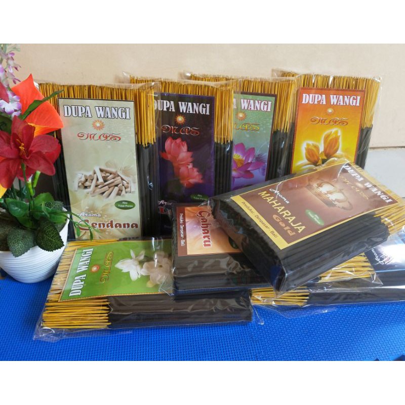 Dupa harum dan wangi untuk sembahyang, pengharun ruangan maupun relaksasiAbu Dupa DINGIN (tdk membuat tangan panas jika terkena abunya langsung)Panjang dupa : 22cmBerat : 500grisi : +/- 300 stik dupaPilihan Aroma yang tersedia : 1. BHAKTI (Produk terbaru - wangi fresh dan seger bagus untuk pengharum dan meditasi)2. Cendana Wangi3. Cempaka4. Super Jasmine5. Teratai India6. Kayu Gaharu 7. Lotus Bali8. Madu wangiDupa celup (bukan semprot) dijamin aromanya lebih awet** Dupa dicelup FullBahan dupa halus pressMenyala awet sampai akhir pembakaran** FREE bubble wrap untuk packing yg lebih aman, Terima Kasih.RESELLER WELCOME...Harga pasti me