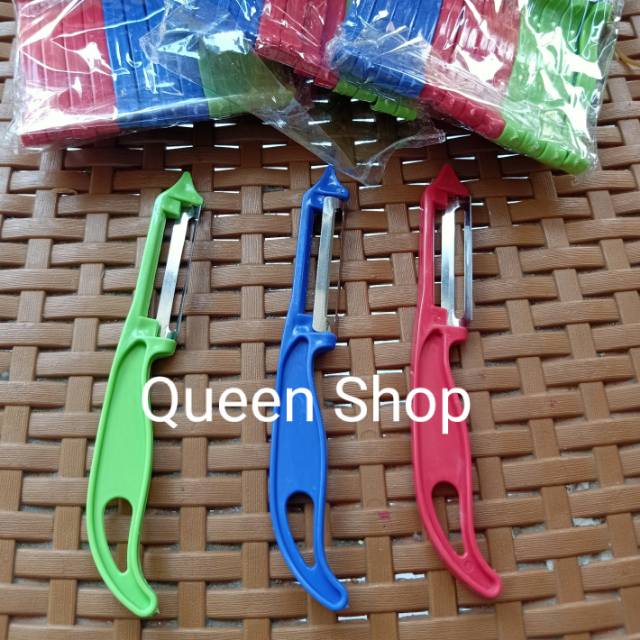 Peeler atau alat untuk mengupas aneka buah dan sayuran...material stainles dan plastikUkuran panjang 14cm,lebar 1,2cm ,panjang mata pisau 5cmHarga tertera untuk 1pcs ,,Tidak pilih warna,warna di kirim sesuai st
