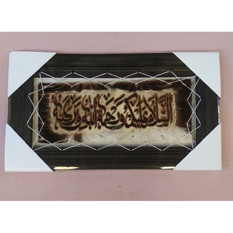 BismillahKami menjual Kaligrafi Kulit Kambing dengan diskripsi produk sebagai berikut:Nama Produk : Kaligrafi AssalamualaikumUkuran : 20cm X 40cm X 3cmBahan Bingkai : Kayu Mahoni Finising Warna HitamBerat : 500 gramWarna Kulit Tidak Sama Karena Menyesuaikan dengan warna kulit