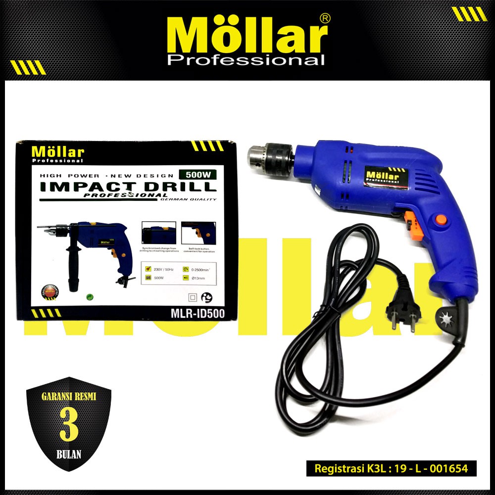 Brand : MOLLARSKU : MLR-ID500Impact Drill 13mm MollarSpesifikasi Mesin :Tipe : MLR-ID500Daya : 500 WDiameter Pengeboran Pada Beton : 13 mmDiameter Pengeboran Pada Besi : 10 mmDiameter Pengeboran Pada Kayu : 20 mmKecepatan Tanpa Beban : 0 - 2.500 RPMBonus : kunci kepala borArah pengeboran bisa bolak-balik (REVERSIBLE)Kecepatan pengeboran dapat diatur (VARIABLE SPEED)Dapat digunakan untuk pengeboran tembok beton (IMPACT DRILL)Tidak termasuk mata borMOLLAR ProfessionalGERMAN QUALITYGaransi resmi = 3 bulan hanya berlaku untuk pembelian di MOLLAR Official Store dengan menyertakan bukti pembelian.Ongkos kirim dari dan ke lokasi service center ditanggung pembeli.Garansi tidak berlaku apabila karena kesalahan pemakaian dan atau barang rusak karena kesalahan k