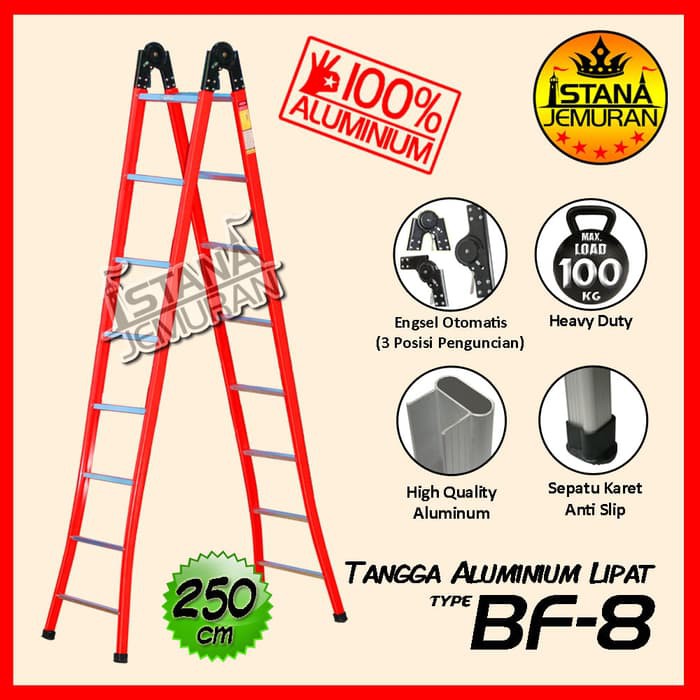 Bahan : High Quality AluminiumWarna : OrangeFinishing : Powder Coating + AnodizingTinggi : 250 cm (posisi huruf A), 500 cm (posisi lurus)Ketebalan pipa : 1,2 mmTangga Aluminium Lipat Engsel Otomatis terbuat dari bahan aluminium berkualitas tinggi yang kuat, anti karat, dan tahan lama. Tangga ini didesain secara khusus untuk penggunaan di dalam maupun di luar ruangan, bentuknya ramping, dan mudah disimpan saat tidak digunakan. Tangga ini dapat menahan beban 1 orang dewasa sampai maksimal 100 kg dengan kondisi normal.Salah satu keunggulan tangga ini adalah engsel otomatisnya. Engsel ini memiliki 3 posisi kuncian yang otomatis akan mengunci saat Anda merenggangkannya sampai batas tertentu, sehingga sangat praktis dan mudah digunakan, bahkan untuk ibu rumah tangga sekalipun.Bagian kaki tangga di-finishing menggunakan teknologi Powder Coating dengan warna Orange yang indah dan tahan la
