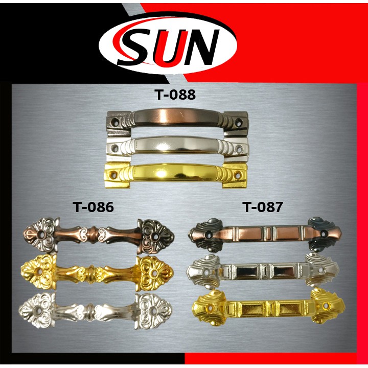 Deskripsi : - Tarikan Laci- Merek TOP- Tersedia * Kode T-086 : Chrome / Emas / Antik* Kode T-087 : Chrome / Emas / Antik* Kode T-088 : Chrome / Emas / Antik( Harap Mencantumkan Kode Dan warna yang Di ingikan atau Kami Kirim Random / acak sesuai stok yang tersedia )- Warna Kuning dan Putih Chrome- Bahan Babet Besi Cor- Panjang 12 cm- Dilengkapi Sekrup- Harga satuan----------------------------------------------------------------------------------------------------Lagi memperbaiki meja atau membuat meja tentunya butuh tarikan laci ini cocok sekali karena modelnya modern dan kuat tentunya.Salam,Sun har